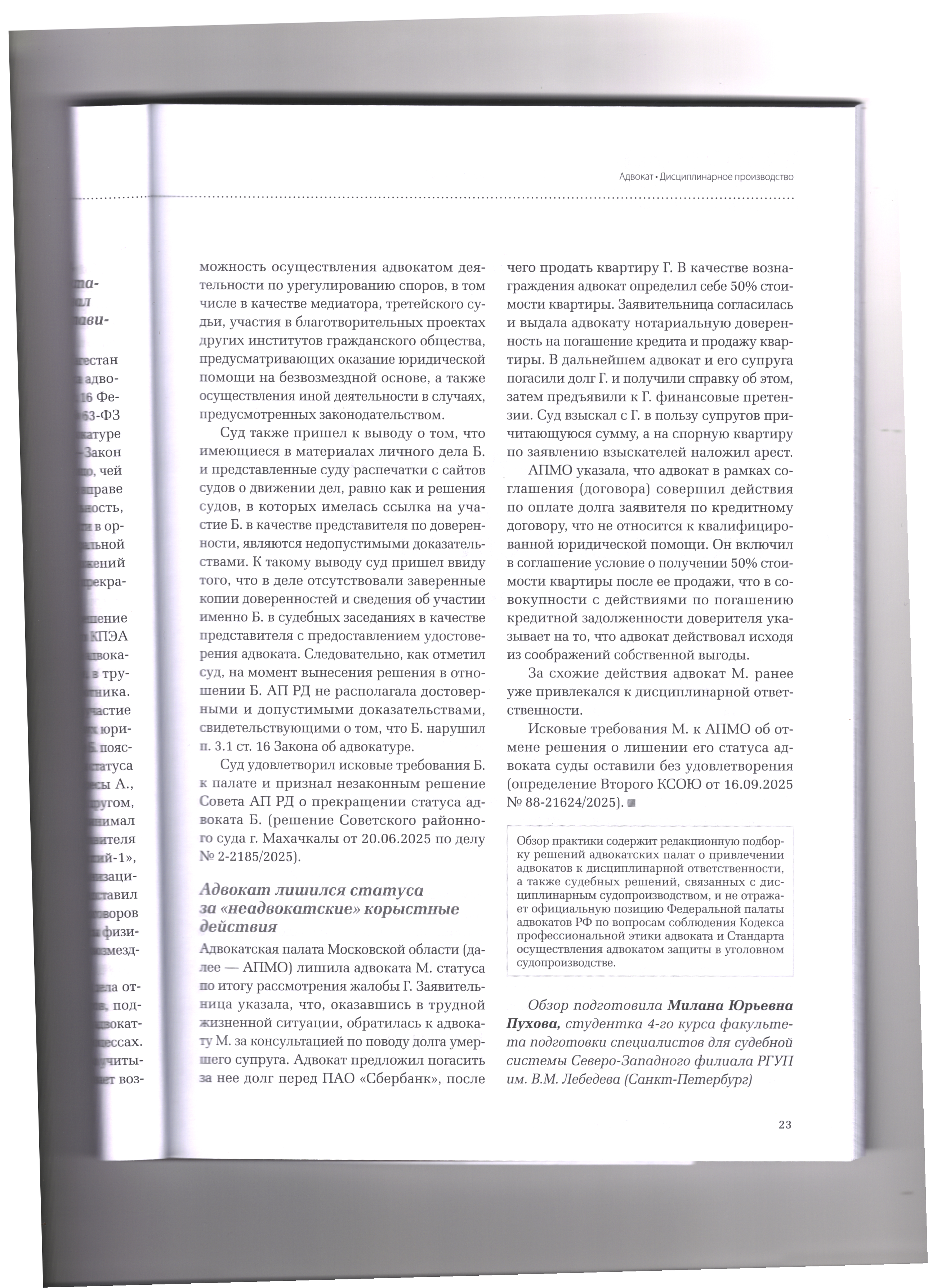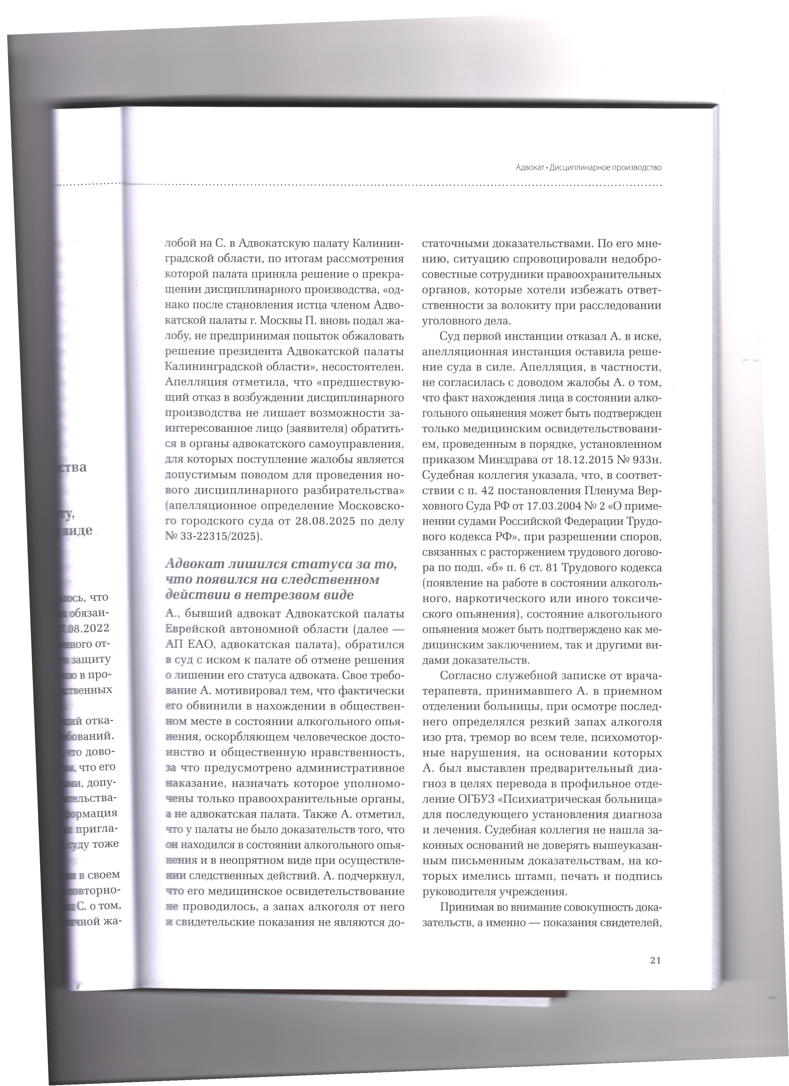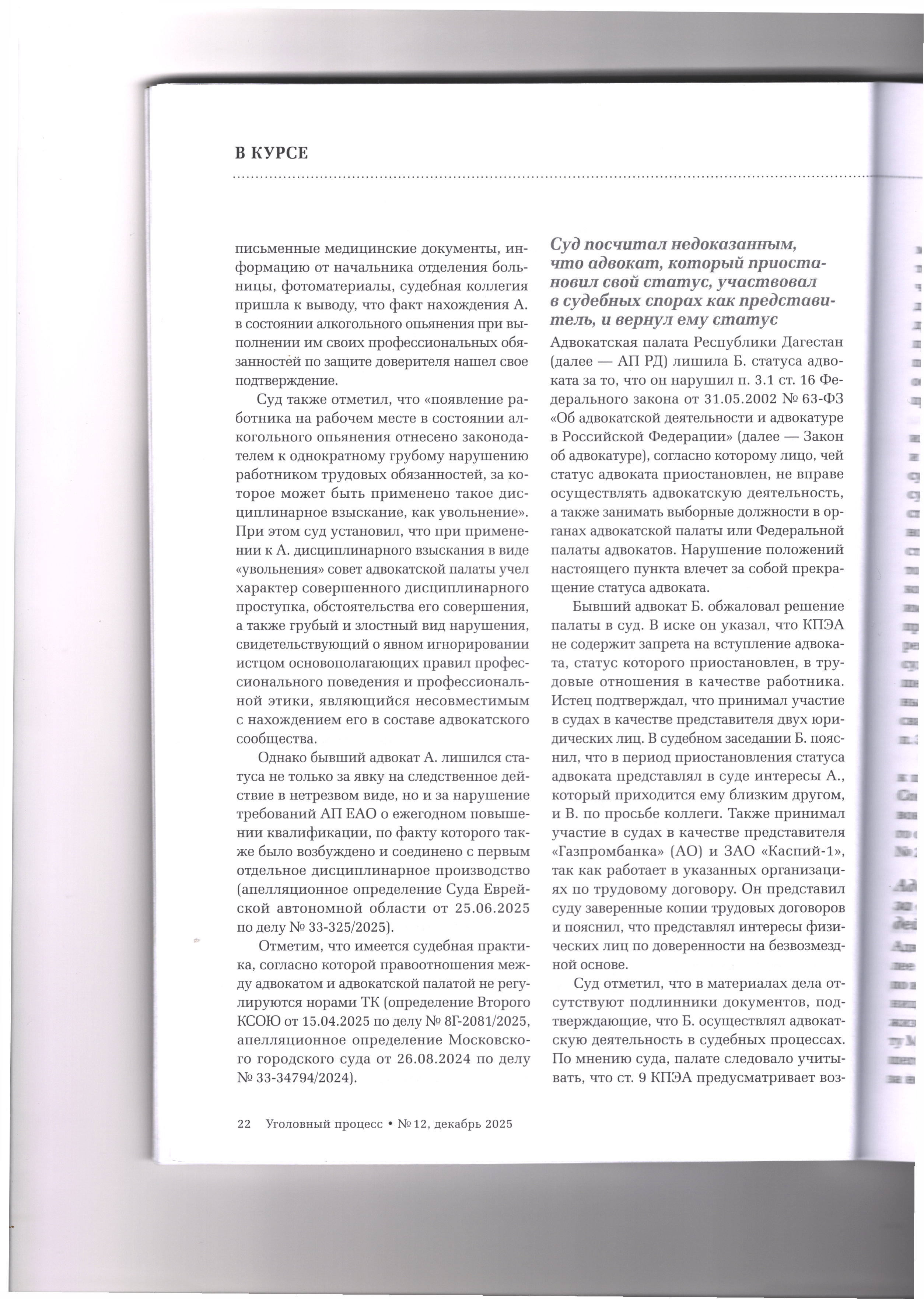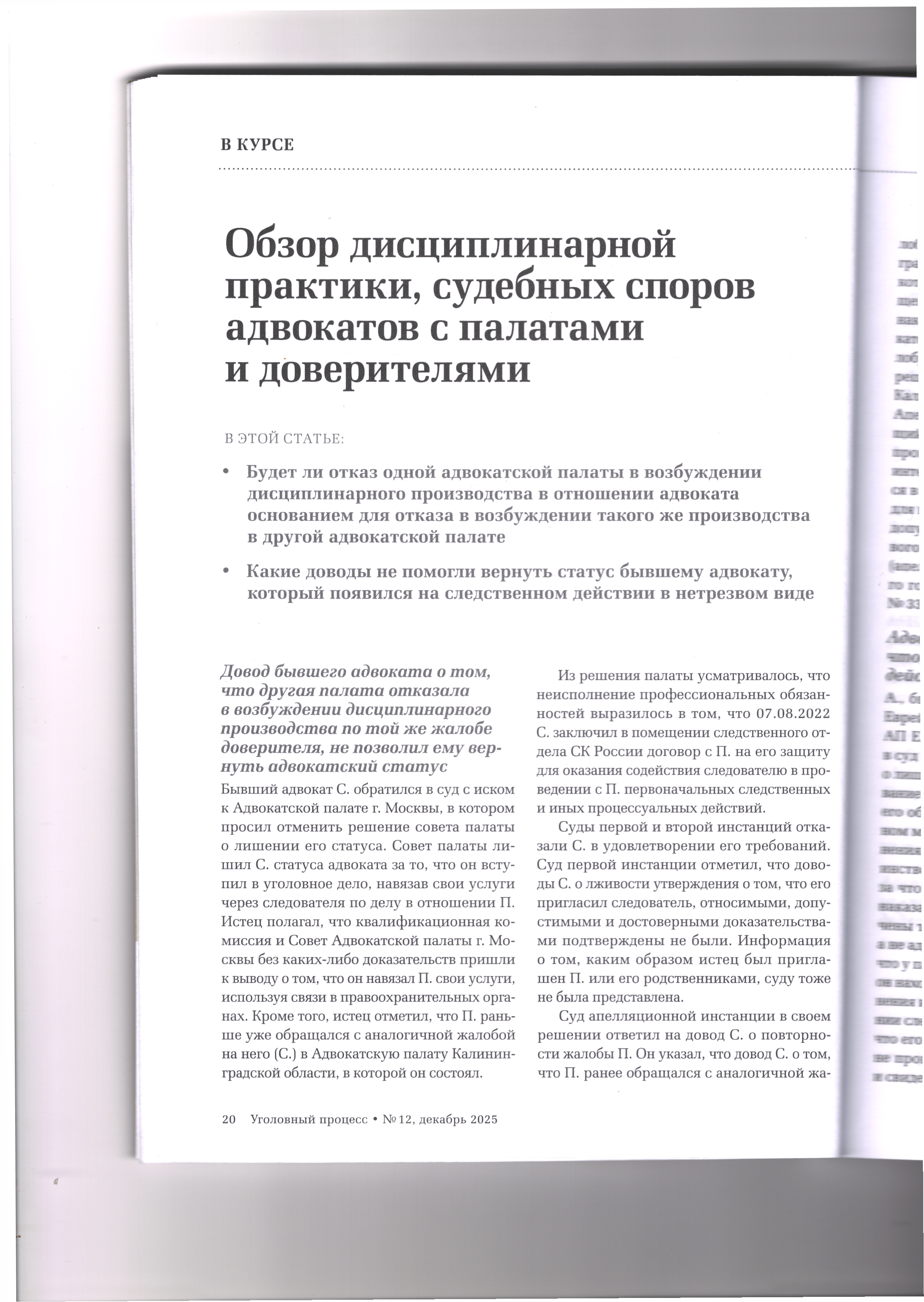 03.02.2026 Обзор дисциплинарной практики судебных споров адвокатов с палатами и доверителями Журнал «Уголовный процесс» №12/2025