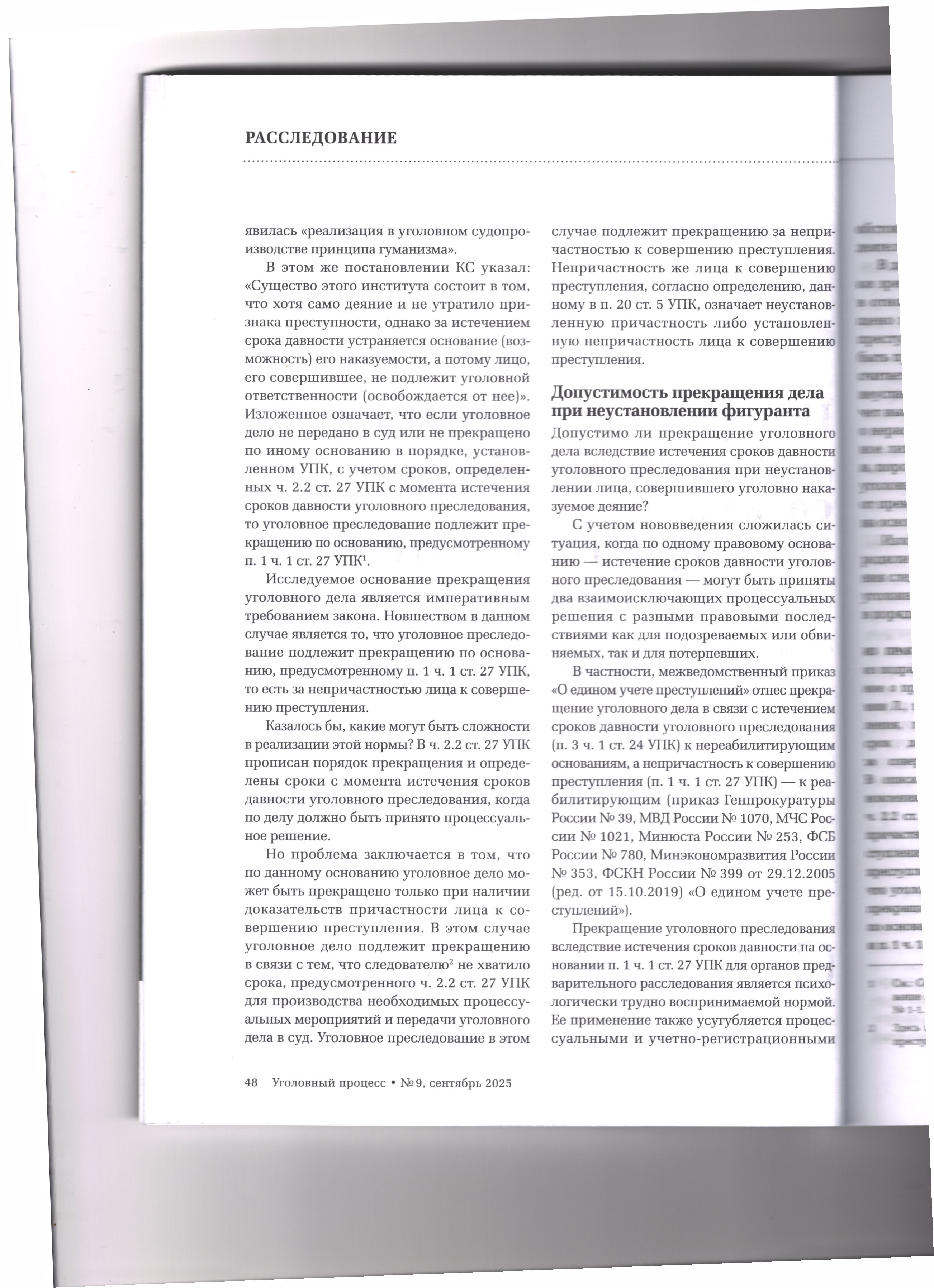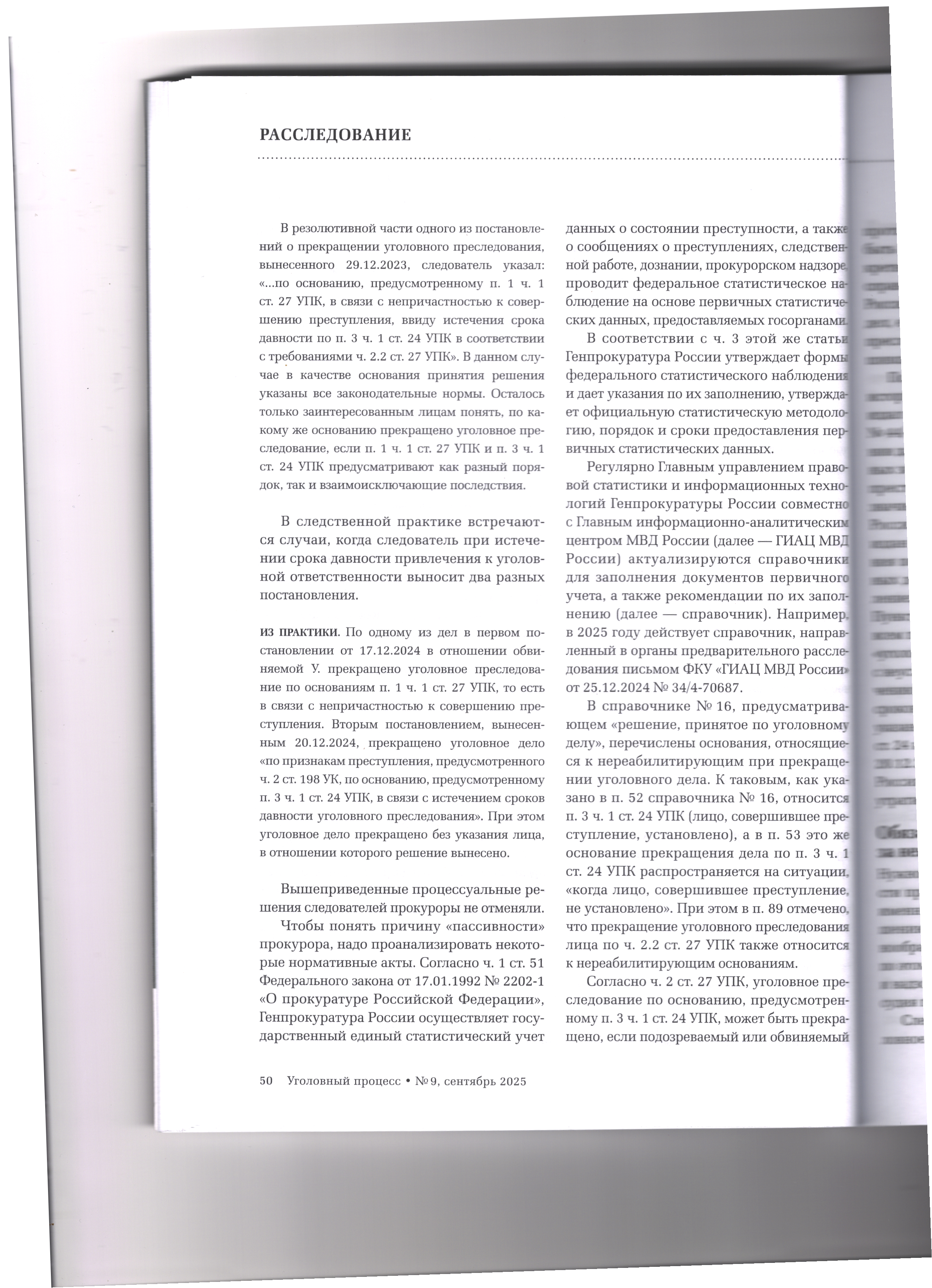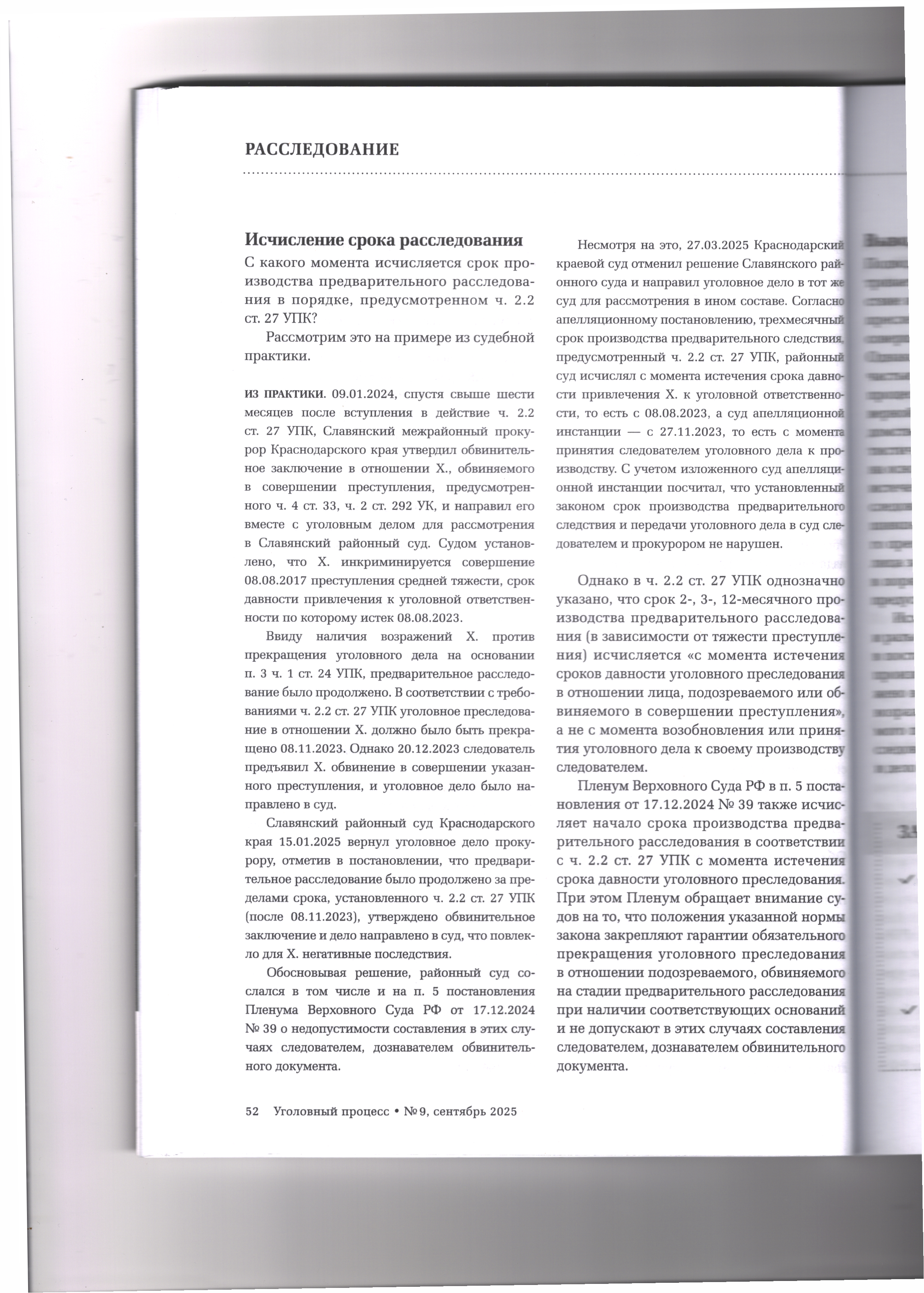 версия для печати 18.11.2025 Прекращение уголовного дела за пределами срока давности:три вопроса из практики Журнал «Уголовный процесс» №9/2025