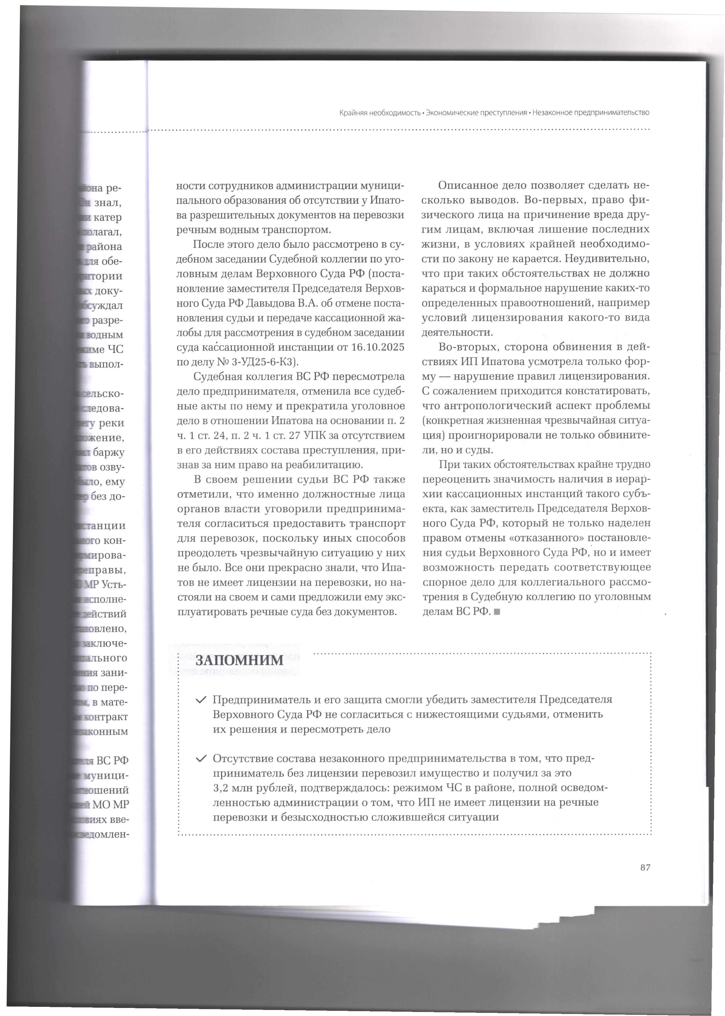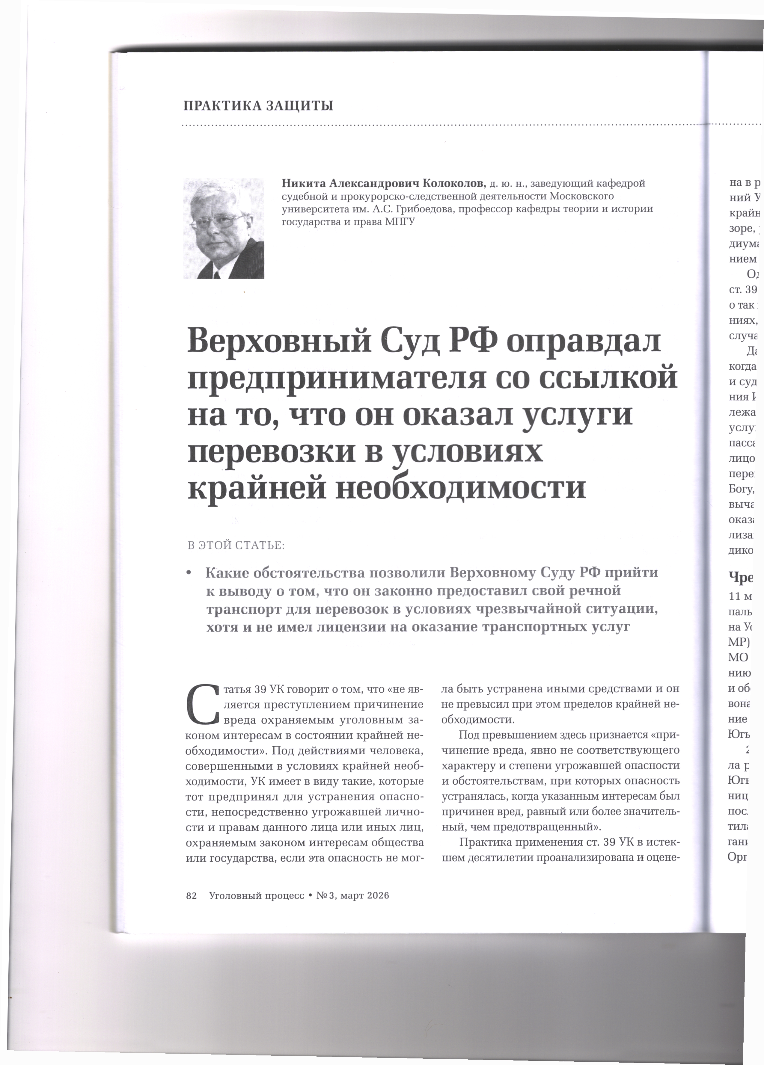 Коллегия адвокатов-ученых›Состав коллегии›Личный кабинет›29.04.2026 Верховный Суд РФ оправдал предпринимателя со ссылкой на то, что он оказал услуги перевозки в условиях крайней необходимости Журнал «Уголовный процесс»№3/2026