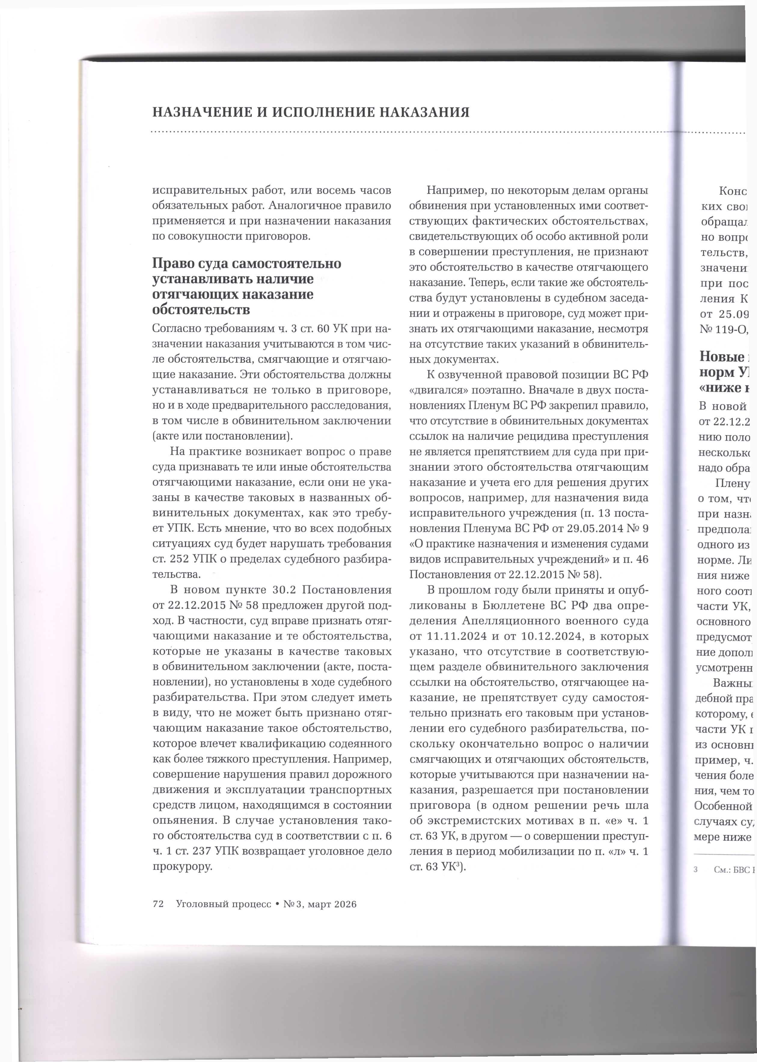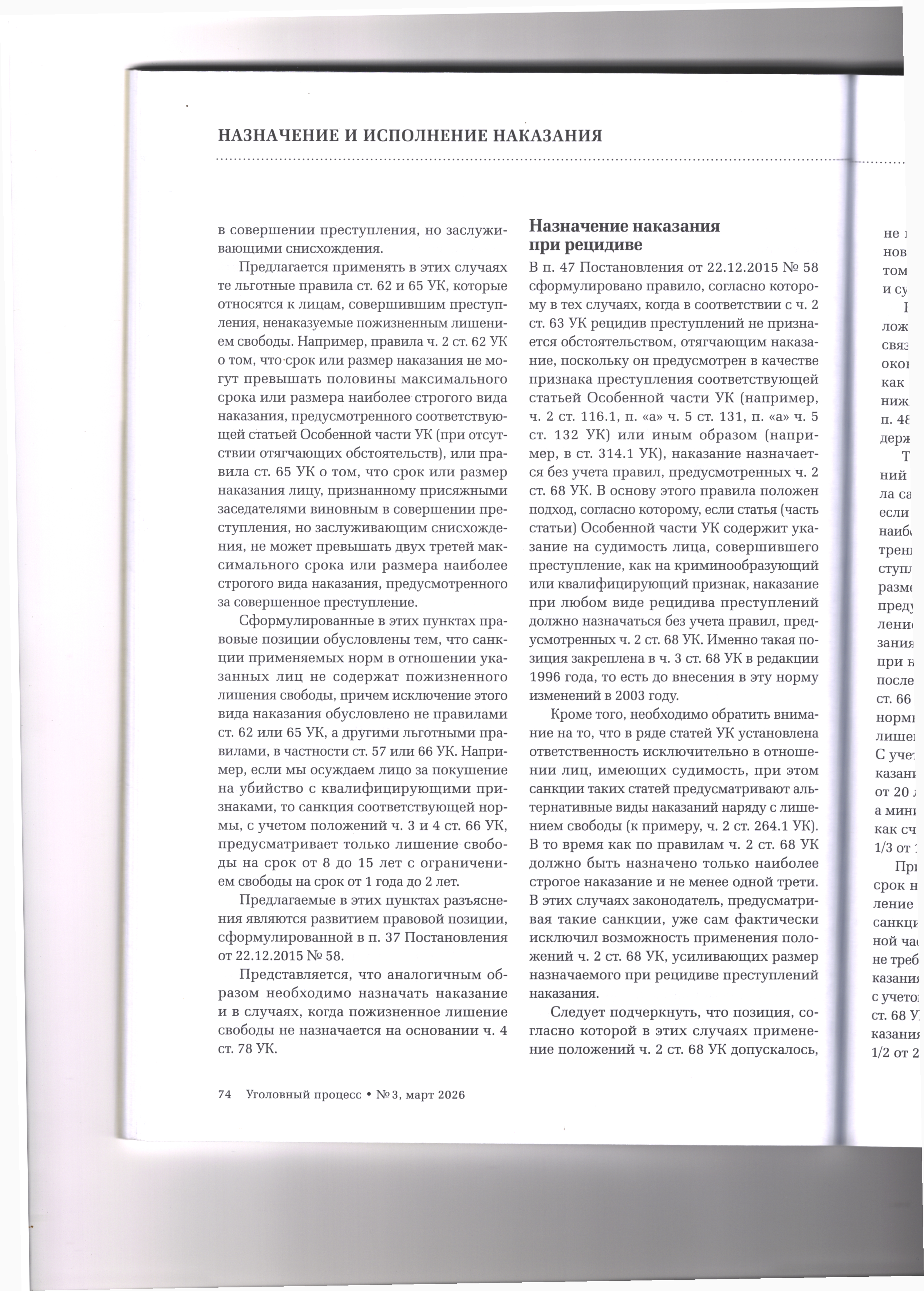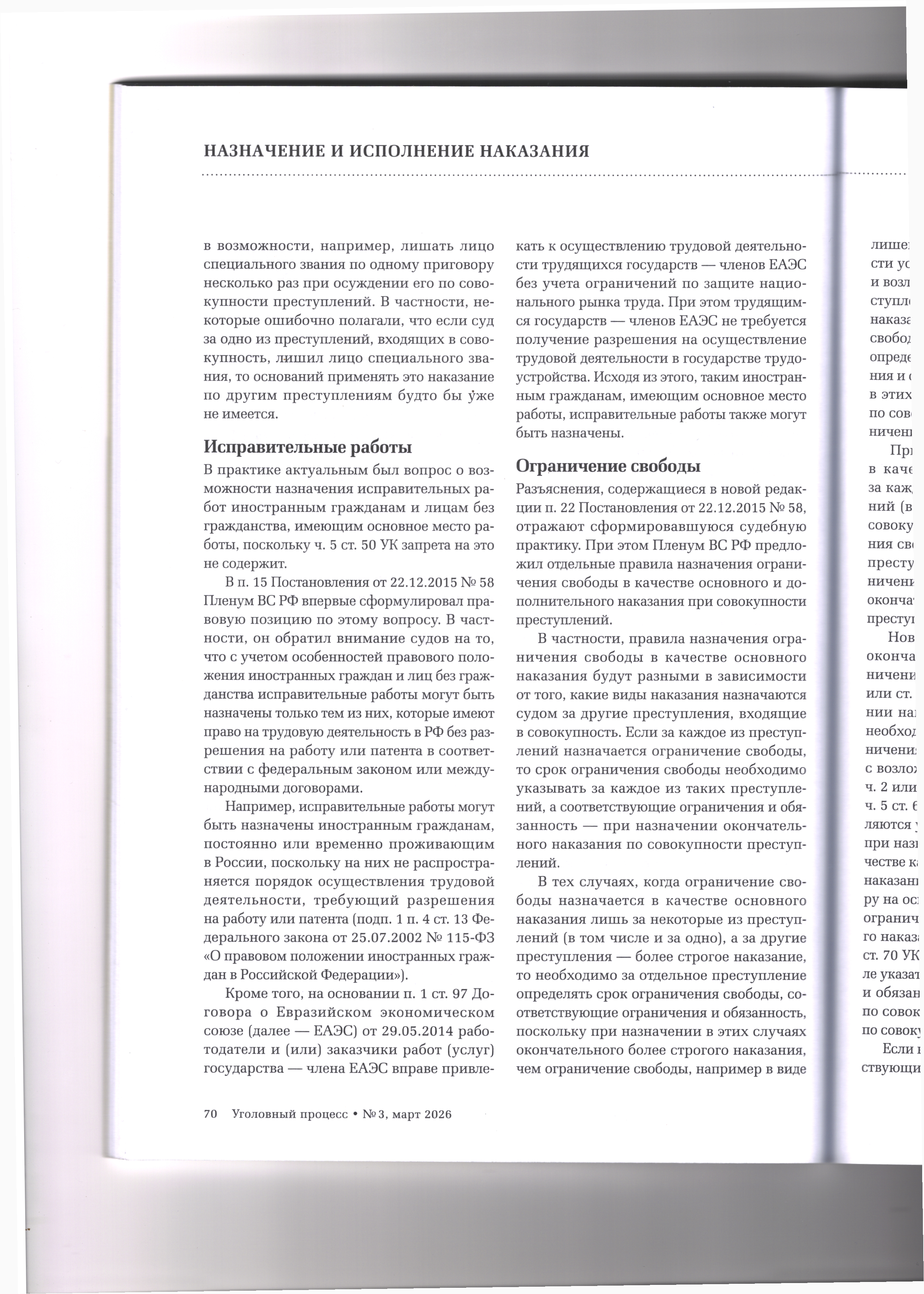 версия для печати 29.04.2026 Новые правовые позиции Верховного Суда РФ по назначению наказания Журнал «Уголовный процесс» №3/2026